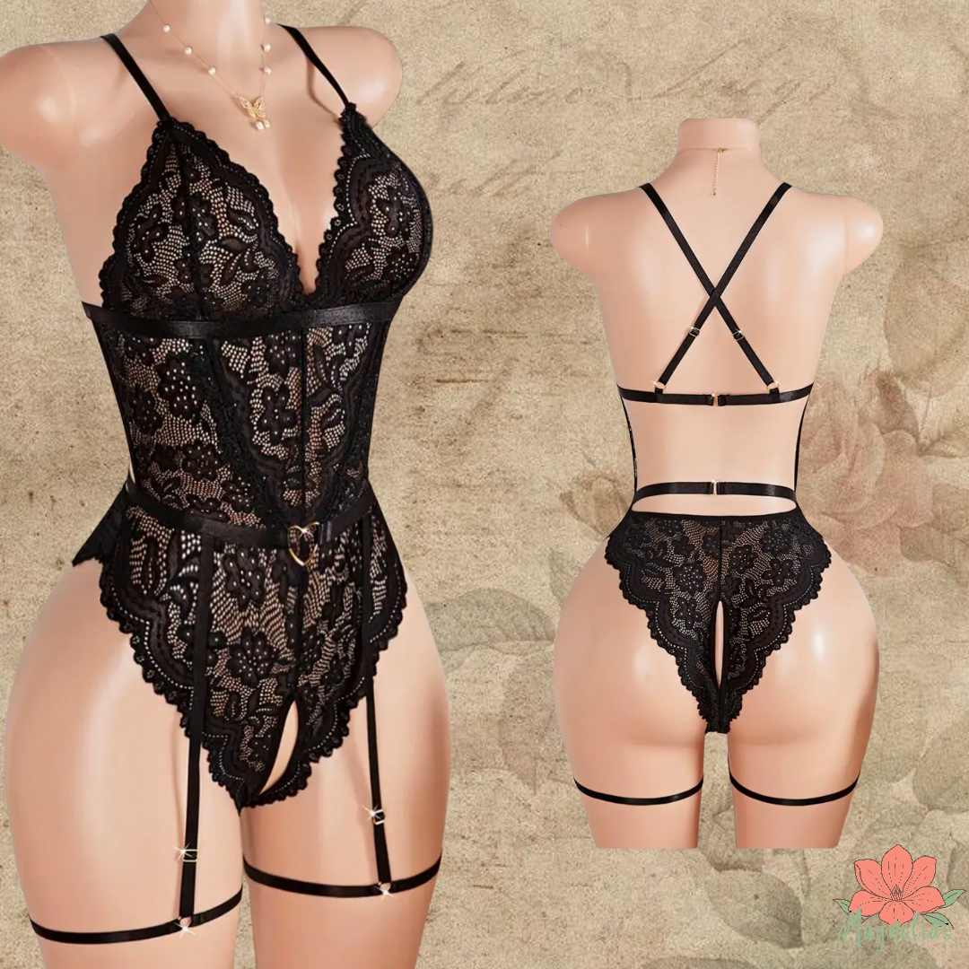 Deslumbra con este conjunto de lencería de encaje floral en un solo color, creado para resaltar tu lado más sensual y femenino. La camisola de cuello en V con diseño cruzado estiliza tu figura y realza tu escote, mientras que el body abierto añade un toque atrevido y seductor.