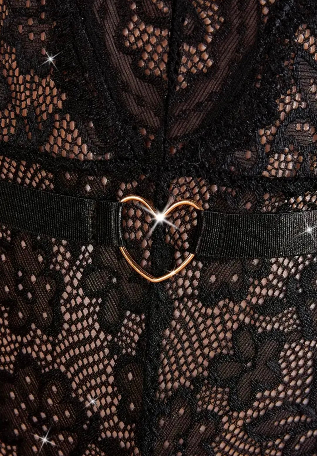 El detalle distintivo es su liga con corazón de metal, un accesorio coqueto que aporta un aire juguetón y romántico.