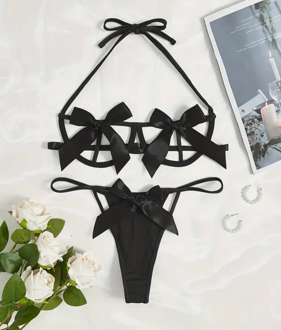 Haz que cada momento sea inolvidable con este conjunto diseñado para resaltar tu sensualidad. Incluye un sujetador con tiras halter ajustables, que enmarca el busto con un estilo atrevido, y una tanga recortada que añade un toque provocador y juguetón.